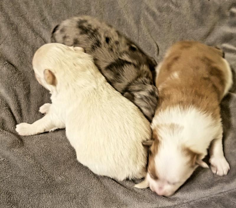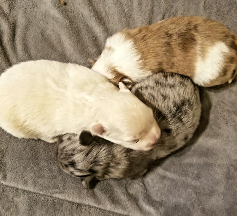 SASSY BLUE HAD TWO FEMALES AND ONE MALE ONE WHITE FEMALE ONE BLUE MERLE FEMALE AND ONE PARTY MALE