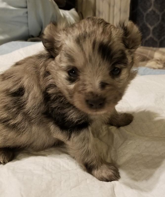 SASSY BLUE HAD TWO FEMALES AND ONE MALE ONE WHITE FEMALE ONE BLUE MERLE FEMALE AND ONE PARTY MALE